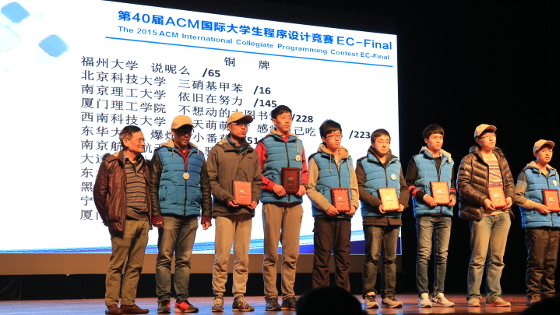在今年的第40届ACM-ICPC竞赛中,我校分别在上海大都会赛上摘取一枚铜牌,在亚洲区域赛的长春、沈阳两站各摘取一枚银牌,在亚洲区域赛的上海站摘取一枚铜牌。这次“三硝基甲苯”代表队在亚洲东大陆总决赛中摘铜,取得了我校参加ACM-ICPC国际大学生程序设计竞赛以来的最好成绩。至此,我校本赛季ACM-ICPC竞赛圆满收官。