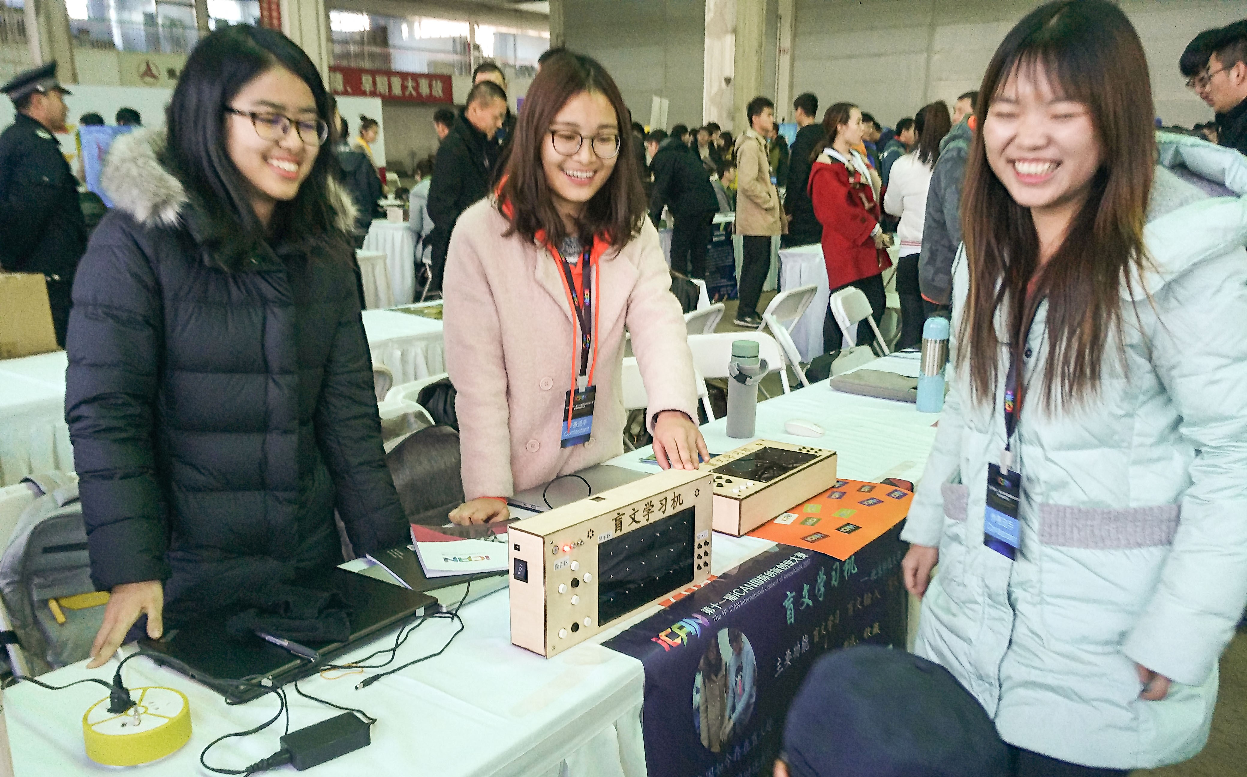 我校的9支队伍完美展示了自己新颖的创意和自信的风采,给各位评委及嘉宾留下了深刻印象,闪耀决赛舞台。来自全国30余省份、北京大学、北京航空航天大学、华中科技大学、国防科技大学、北京科技大学等二百余高校的六百余个团队共上千名学子参加了总决赛角逐,内容涉及智能制造、智能教育、智能穿戴、智慧交通、节能环保、健康监护、智能传感、智能机器人、智能家居等多个领域。