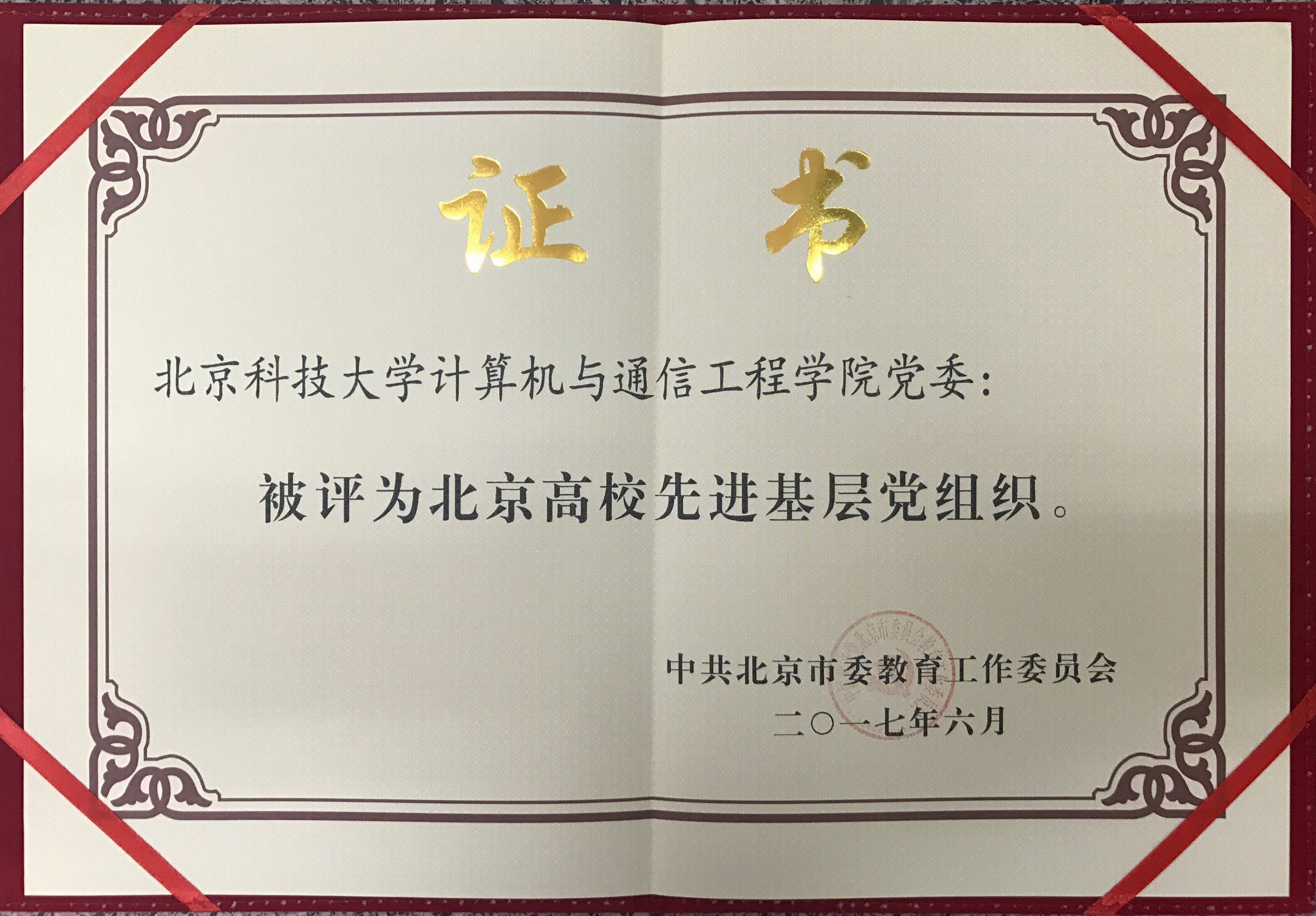 北京高校先进基层党组织由中共北京市委教育工作委员颁发,旨在总结高校党组织建设和党员队伍建设先进经验,进一步增强基层党组织创造力、凝聚力和战斗力。今年,北京市教育工委共评选出30个先进基层党组织单位。