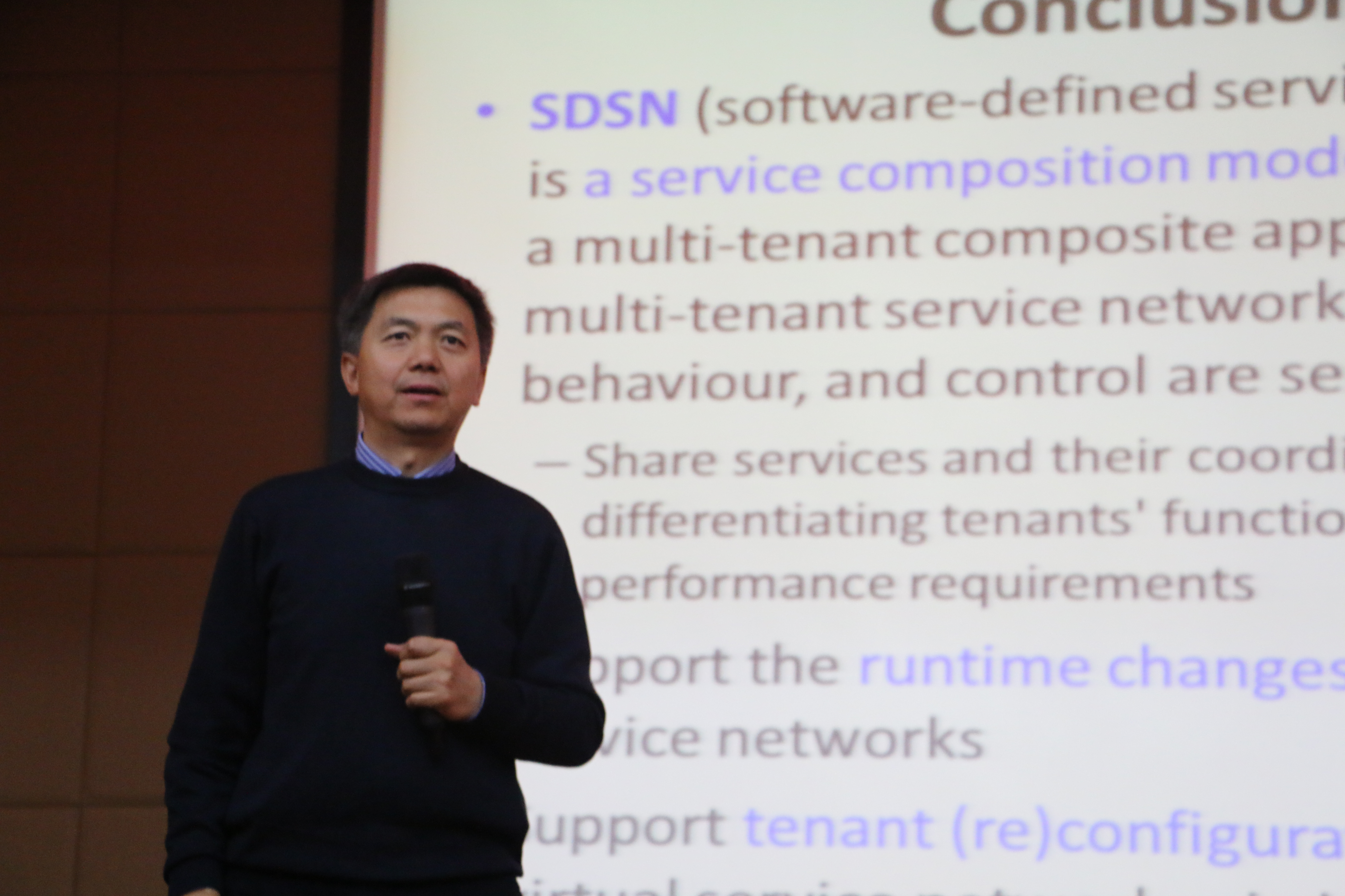 在韩教授的报告中,他首先介绍了软件定义的服务网络(Software Defined Service Network)的概念与基本原理。韩教授讲道,未来是一个可以通过网络化的云实现物联网和人联网互相交互的世界。在这种环境下,(软件)服务是普适的,这将易于集成,能够整合形成具有特定目标的新应用程序,而且能在多租户之间共享。然而,在这样一个云应用程序环境下,要实现共享服务运行时随特定租户的功能与性能的变化而变化,这具有一定的挑战性。他及其团队采用软件定义的服务网络(SDSN)来应对这一挑战问题,提出的方法通过有管理的服务网络和相关的虚拟服务网络(VSNs)实现组合式的云应用程序。研究结果表明:软件定义的服务网络是可行的,在没有引入太多运行耗时的前提下表现了良好的效果。