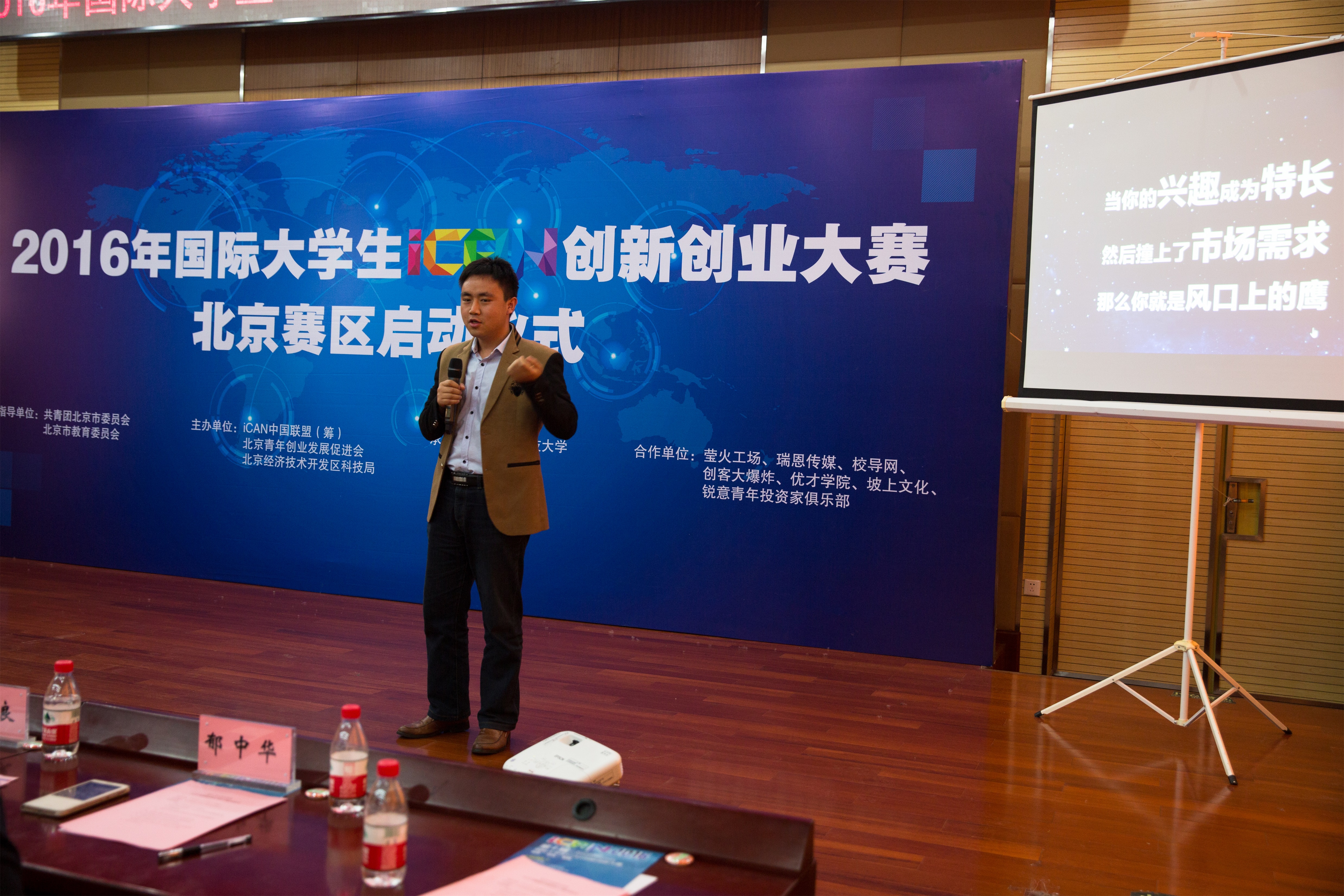 北京团市委事业部部长、北京青年创业发展促进会秘书长张楠致辞,他介绍了北京共青团促进青年创新创业的主要做法和丰富活动,解读了国际大学生iCAN创新创业大赛对青年学生成长的重要意义,勉励参赛学生在大赛平台上启航创业梦想、勇作首都产业升级进程中的生力军。iCAN大赛运营总监张祥介绍了大赛规则,北京市物联网产业规划首席科学家、通天论坛