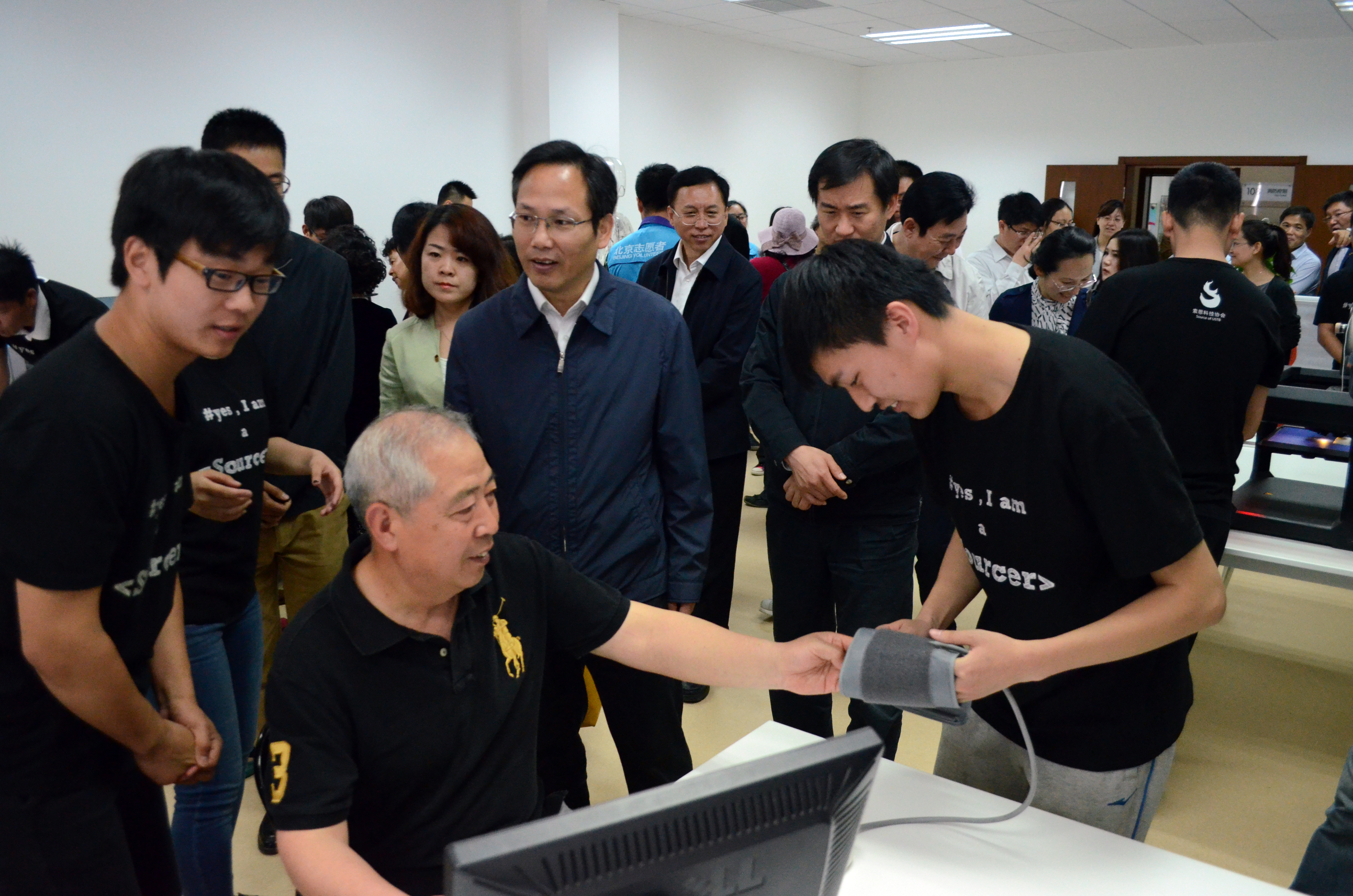 在索思科技协会副主席郑智予的解说下,徐书记一行了解了索思科技协会以及本次志愿服务项目的开展情况并实地体验了所有参展的科创作品,这些都是索思的同学们亲手制作发明的一些科技“利器”——具有老人跌倒自动报警及障碍物检测功能的智能拐杖、利用语音控制家居开关及聊天功能的智能养老机器人、中医知识科普及穴位经络检测的中医机器人、利用全息投影技术科普养生常识的3D幻影互动小人和血压、脉搏等健康指标检测记录分析的智能社区管理系统,这些诞生于学生科技创新实验室中的神奇发明为老人们提供了生活的便利,赢得了社区百姓的欢迎。同时徐书记还与正在现场通过智能社区管理系统测量血压的老人亲切互动,他询问了老人们本次活动的感受,老人纷纷表示学生们的热情很高,现在的科技很强大,给生活提供了很多便利。