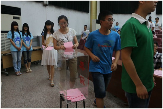 随后,会议进入了紧张严肃的演讲环节。在院学生会副主席袁越同学宣读选举办法和监票人、计票人名单之后,前期通过答辩入围选举大会的11位主席团候选人慷慨陈词,激情展示自己的竞选优势和工作设想,并抽取问题进行作答,现场气氛也随之高涨。演讲完毕后,由总监票人袁越同学主持选举环节,来自各班的93名学生代表行使参与民主管理的权利,将自己神圣的一票投入到投票箱中。投票过后,辅导员蒋灵斌、陈凯、马力、王基镔悉心地对每一位候选人的演讲表现进行点评。最后,经过认真而紧张的计票,主持人宣布了投票选举结果以及拟当选的通天论坛