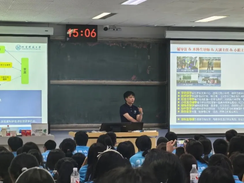 的历史沿革讲起,清晰阐释了辅导员、大班主任及小班主任的职责定位,深入解读了本科生导师制的具体内容与重要意义,同时对新生入学各项注意事项、军训相关须知等实用信息逐一说明。深入浅出的讲解让同学们对校园环境、学习资源、生活安排及未来成长路径有了全面且清晰的认识,不仅为大家快速适应大学生活提供了指引,更引导同学们理解并认同学校的文化传统与精神内核,逐步厚植爱校荣校的归属感与使命感。