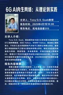 主讲人介绍:Tony Q.S.Quek,新加坡科技与设计大学郑曾文讲座教授和ST工程特聘教授,IEEE Fellow,WWRF Fellow,新加坡工程院院士,于东京工业大学获得电气与电子工程学士和硕士学位,麻省理工通天论坛